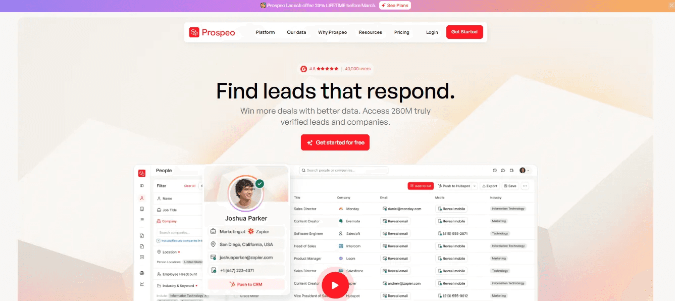 GetProspect | Lead management and list building | $49/mo | Yes (50 Emails) | 90-95% | 4.0/5 |