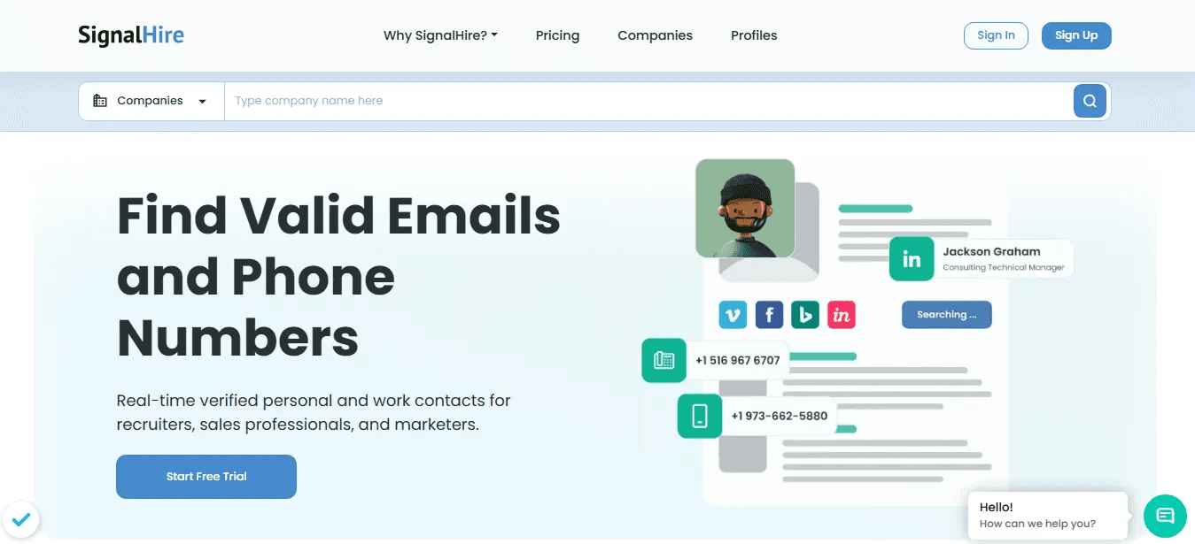SignalHire | Finding direct mobile numbers & social | $69/mo | Yes (5 or 10 Credits) | 90-95% | 4.4/5 |