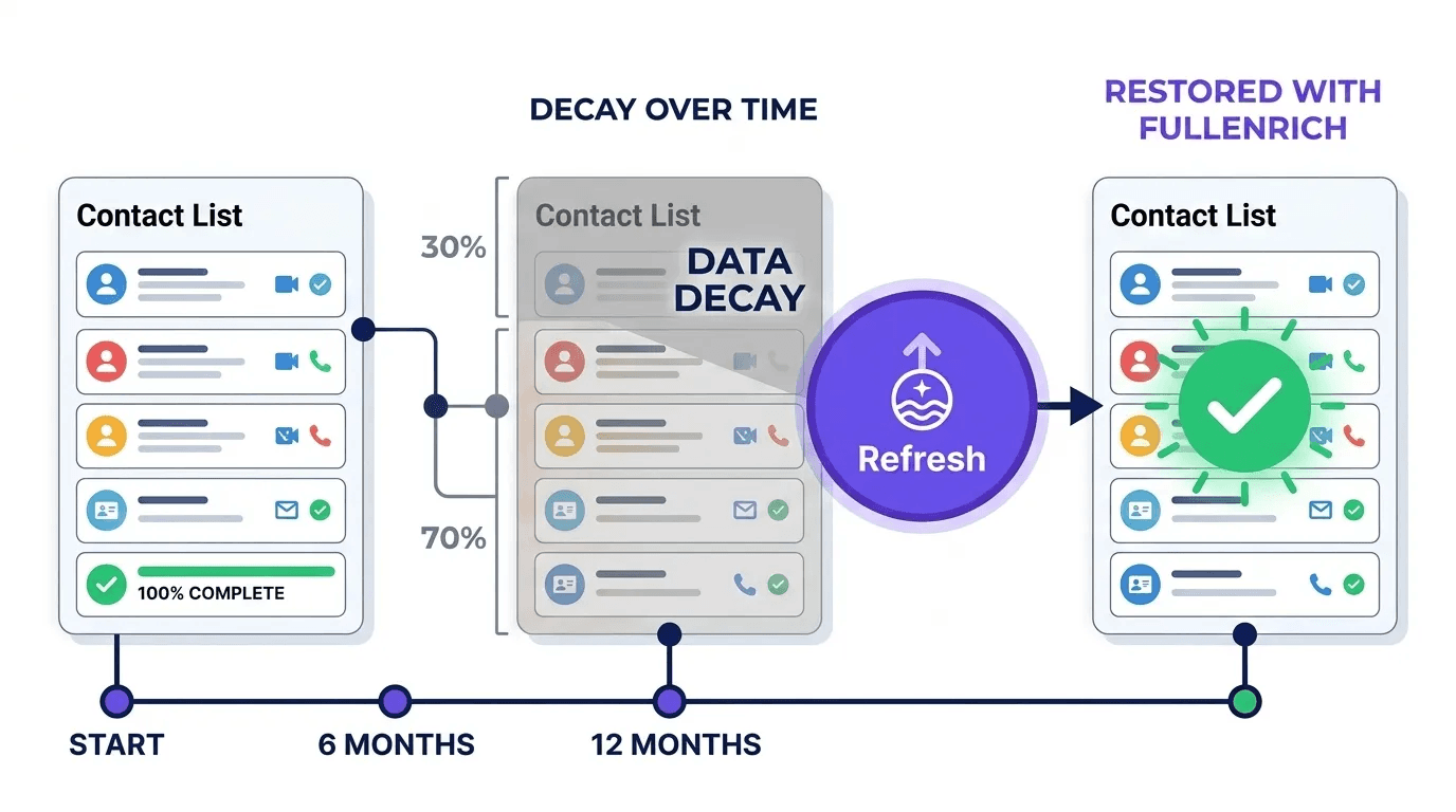An SDR's outreach sequence can only reach people whose contact details are verified and current. In general observation, it is seen that a list built in January and not refreshed will have one in four contacts degraded by December. The reason is B2B professional contact data decays at 25 to 30 percent per year as people change jobs, companies get acquired, and email addresses change.