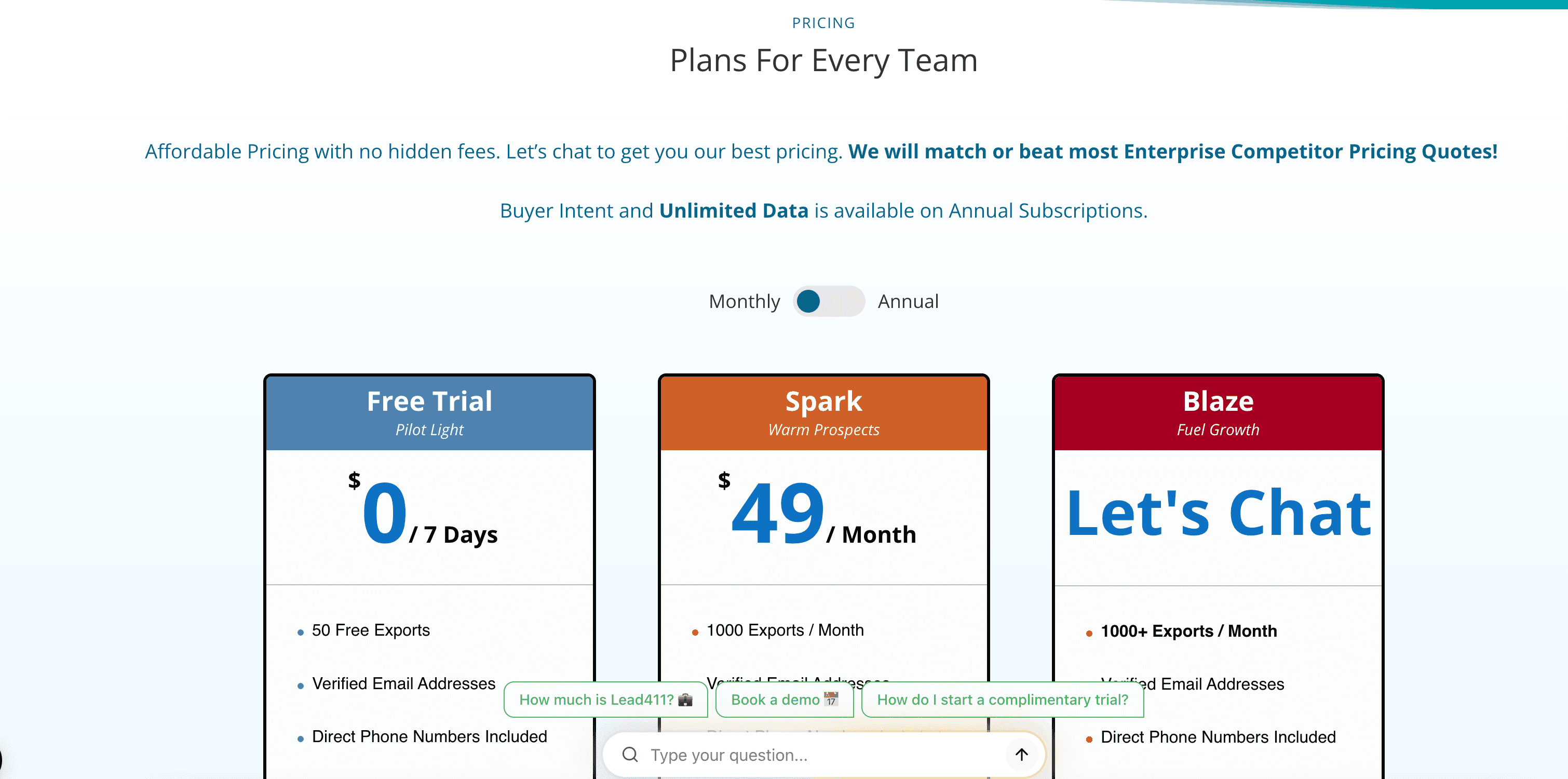 Lead411 focuses on one thing: verified B2B contact data that works. They triple-verify emails, double-verify phone numbers, and throw in Bombora intent signals on annual plans—all starting at $49/month.